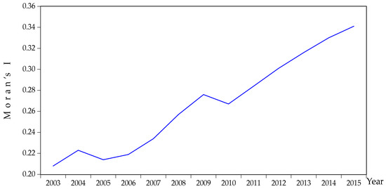 In Table 3, the global Moran’s I of human capital is positive from 1994 to 2015, but the Moran’s I did not pass 95% significance test before 2003, but the Moran’s I did pass 95% significance test after 2003. The following is the trend chart of Moran’s I of Human capital after 2003.