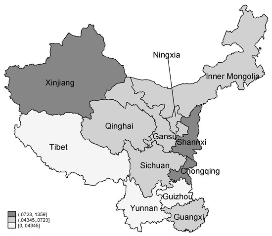 As can be seen in Figure 7 and Figure 8, human capital has more and more obvious spatial spillover effect as time goes by, the closer the region is to the center, the higher the human capital is (Figure 7 and Figure 8 only show the western regions of China, while the eastern and central regions in China are not included). Shaanxi and Chongqing, compared to the other regions in the west, have more geographical advantages and more neighbor provinces. They have greater probability to attract students and to send students out, so the human capital is relatively high.