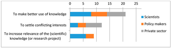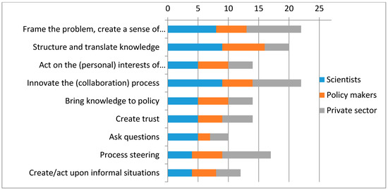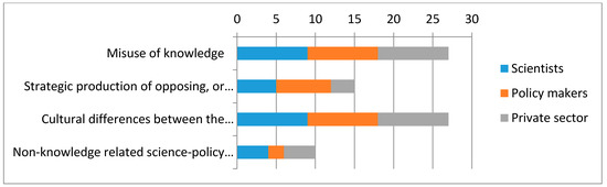 Finally, based on the analysis presented in Figure 1, two additional remarks can be made. First, the strategic production of knowledge appears to be a problem predominantly discussed by the interviewees with a policy background; scientists discussed the strategic production of knowledge to a lesser extent. This strategic behaviour is often addressed in the literature on science–policy interactions: for example, Strydom et al. [43] argued that scientists keep science out of reach of policy makers in order to ensure that they retain their control on the interpretation of science. If policy makers experience this the most, it is hardly surprising that these knowledge brokers emphasise this issue. On the other hand, scientists and consultants discuss problems that are not limited to knowledge more often by than policy makers. The reason could be that the interviewed knowledge brokers from the private sector, for example, tend to be brought into a process to solve whatever interaction issues there might be, whether or not these are to do with the use and production of knowledge.