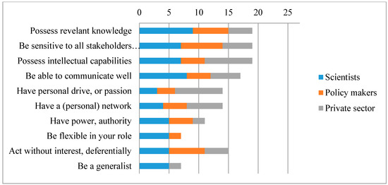 Competences, qualities, and capabilities of knowledge brokers mentioned during interviews, categorised per knowledge broker ‘type’ and quantified accordingly.