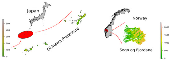 Geographic location of the two case studies: (left) Okinawa (Japan), (right) Sogn og Fjordane (Norway). The colors show the elevation profile in m (see legend).