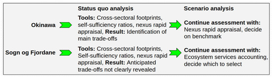 Figure 2 provides an overview on the tools selected for application to the case studies. As we will show in the following discussion, the initial set of tools (cross-sectoral footprints, self-sufficiency ratios, nexus rapid appraisal) were only partially able to identify anticipated trade-offs in the regions. This led us to continue the evaluation of the energy scenarios using the ESS approach for the case of Sogn og Fjordane, whereas we continued with the nexus rapid appraisal for the case of Okinawa.