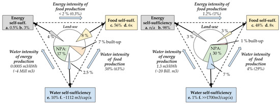 Figure 3 presents the main results for cross-sectoral footprints for both regions as well as self-sufficiency indicators as of 2010 (if not otherwise stated). The former are expressed in intensities, more specifically the consumption of electricity in agriculture, the amount of water needed for energy and food production, and the land required by the energy, food and water sectors. Self-sufficiency ratios for energy, food, and water are given as (a) the share of renewables in primary energy supply; (b) the share of renewables in electricity consumption; (c) the ratio of domestic food production to domestic consumption; (d) the food import-export ratio; (e) annual freshwater withdrawal as share of available freshwater resources and (f) yearly renewable water available per capita. Additionally, we provide the share of agriculture in final energy (refer to the number in brackets below the energy intensity of food production), the absolute amount of water used for energy production, the reserved land for nature protected area (NPA) and the share of built-up area.