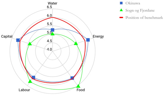 Table 4 presents selected sustainability indicators based on nexus rapid appraisal for both regions as suggested in [13]. We combine the scores of the performance indicators into one overall performance score for each of the five nexus aspects (energy, food, water, capital and labor). Figure 4 maps these final performance scores for Sogn og Fjordane and Okinawa against a benchmark performance score for affluent, partly resource constrained countries. To highlight the results of the nexus assessment, the benchmark has been arbitrarily fixed at position 6 in the plot for all dimensions. Deviations above this benchmark indicate potential problems with sustainable development. Refer to Section 2.2.3 for further details on this method.