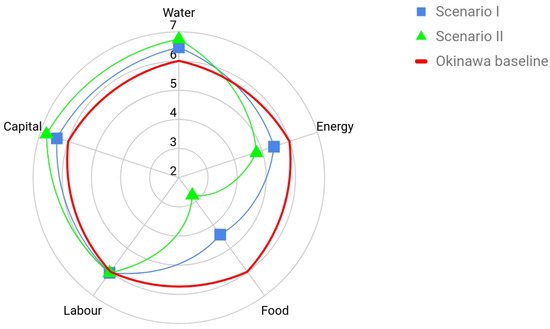 The scenario analysis for Okinawa’s renewable energy expansion is performed with the help of the nexus rapid appraisal [6,13]. Figure 5 maps the final performance scores for Okinawa for two future energy and food self-sufficiency scenarios against its current performance scores (see Table 4). Although Okinawa envisions an ambitious transition to renewable energies by a notable increase in installed capacities as shown in the figure, there continues to be a heavy dependence on fossil fuel for electricity production. Even in the more stringent scenario, 80% of the electricity is generated from fossil energy carriers. In case of scenario I, the land footprint of energy increases twofold, while it increased five-fold in case of scenario II. The largest shares are required by wood (above 40%), sugarcane (above 20%) and digestion gas (roughly 20%) due to their high footprint factors. Even a 25-fold increase in solar PV to 1.8 TWh only consumes 7% of the land required for energy production in the “Increased Self-Sufficiency Scenario”. Clearly, by favoring solar PV over biomass production, the land-energy trade-off could be considerably reduced. An exception may be the use of next-generation multi-purpose crops such as sugar cane. A promising example is the new cultivar KY01-2044 which yields 1.5 times more biomass and contains 1.3 times more sugar even in poor environments [107]. Note that we have assumed this efficiency in the future scenarios.
