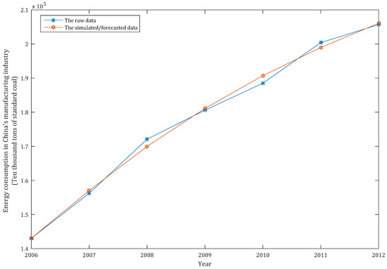 Data are applied to build the HGEM(1,1) model of the energy consumption of China’s manufacturing; and the last data is used to check the prediction performance of the HGEM(1,1) model.