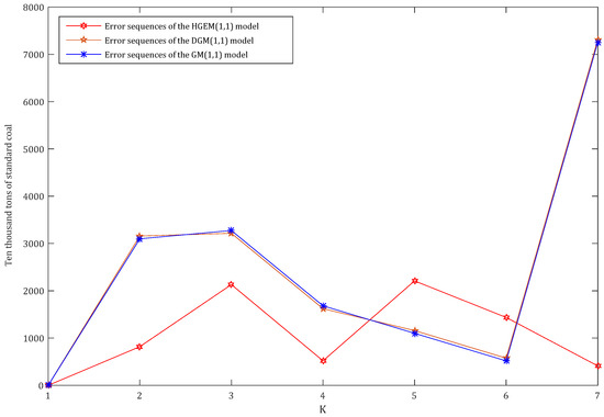 When , we can simulate the energy consumption of China’s manufacturing; when , the energy consumption of China’s manufacturing can be forecast. In order to compare the simulation and prediction performance of the HGEM(1,1), we also apply the classic GM(1,1) model and the frequently-used DGM(1,1) model to simulate and forecast the energy consumption of China’s manufacturing industry. All the simulation and prediction results of the above three models are shown in Table 2, as follows: