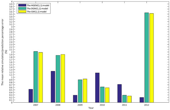 The mean relative simulation/prediction percentage error of HGEM(1,1), DGM(1,1) and GM(1,1).