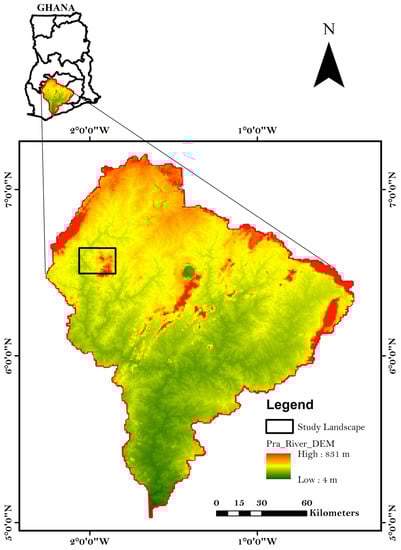 The study landscape is located between Latitude 6°31′00′′ N and 6°37′30′′ N and Longitude 2°4′30′′ W and 1°54′00′′ W. The area, 408.5 km2, was delineated from the Pra River watershed (Figure 1). It covers part of the Atwima Mponua, Atwima, and Amansie West districts. The landscape was selected based on several considerations emanating from the research problem such as the involvement of indigenes in the sector, the extensiveness of the activity, etc. However, the spatial and temporal extent of the study area were delineated considering the poor availability of historical satellite imageries. The area is part of the wet climatic zones that experience a double maxima rainfall (i.e., major and minor rain seasons). The area experiences high rainfall ranging from 1250 mm and 2000 mm. The area records a relative humidity that fluctuates from 70% to 80% throughout the year. Usually, the temperatures of the area fluctuate between 26° and 30° Celsius. Characterised by a relatively flat landscape, the area has an undulating topography and a mean elevation of 450 m above mean sea level (MSL). Forest ochrosols are the predominant soils in this area. These soils are formed from the Tarkwaian sandstones and granitoid as well as metamorphosed phyllites and schists. The vegetation is semi-deciduous, comprising of broad-leaved trees with a height range of about 40 cm or more. However, to some extent land use changes have reduced this closed broadleaved forest to climbers, shrubs/short woody plants and species usually found interspersed within tree remnants []. The Water Resource Commission [] estimates that 60% of the area is covered by agriculture land use, while forest accounts for 30%. Moreover, grassland, human settlement, and other land cover types cover about 10% of the entire watershed. The area has a history of small-scale mining because of its world-class Birimain and Tarkwain rock formations [,]. Because of the gold mining activities, most of the settlement is referred to as mining towns.