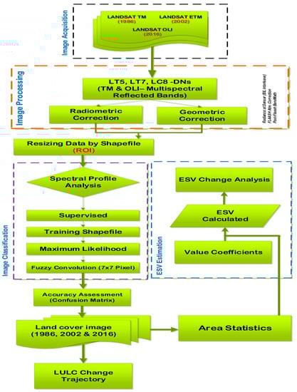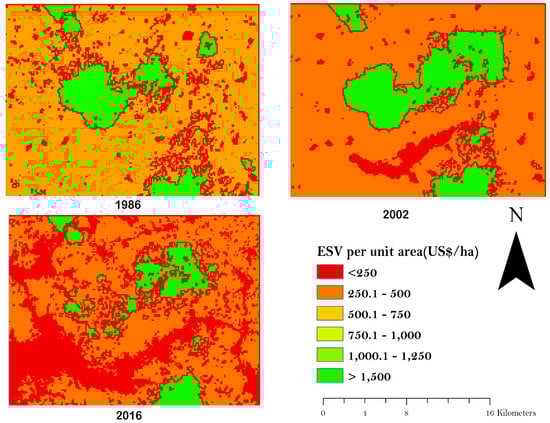 The spatial values of the ES were calculated by following the methodological approach expressed in Figure 2. First, area statistics for each land use type was computed for 1986, 2002 and 2016 by using the ArcGIS Version 10.3 software []. The area statistic of each land use type was multiplied by their respective coefficients (Equation (3)).
