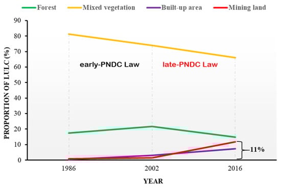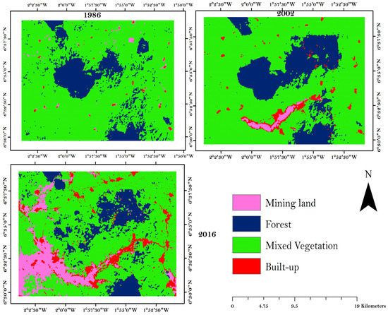 Figure 3 and Figure 4, respectively show the general trends and the spatial distribution of land use and land cover (LUCC) classes of the 1986, 2002 and 2016 images. The area statistics and percent variations in land-uses of the early- and late-PNDCL periods were estimated and summarised in Table 4. A rather irregular but interesting result was observed in the forest cover class. In 1986, the forests occupied 7147.8 hectares, which represents 17.5% of the total study area. By 2002, the forest cover increased to 8886.4 hectares (21.8%) at 1.7% per annum but declined to 6053.4 hectares, which represented 14.8% of the total area in 2016, at 2.0% per annum. The mixed vegetation, which was the largest cover class at 33161.4 hectares and represented 81.2% of the total area in 1986, decreased significantly at 0.6% per annum to 26989.2 hectares (66.1%) in 2016. Moreover, the built-up and mining areas increased substantially throughout the study periods. Thus, the 354.9 hectares of mining land in 1986, which represented 0.9% of the total area, increased significantly to 4804.1 hectares (11.8%) in 2016 at 41.8% per annum. A significantly higher growth rate at 47.5% per annum was observed in the late-PNDCL period (2002–2016) compared to the early-PNDCL period (1986–2002), which grew at 4.1% per annum. Similarly, the built-up area increased steadily from 189.6 hectares, which represents 0.5% of the total area in 1986, at 49.5% per annum to 3007.17 hectares (7.4%) in 2016.