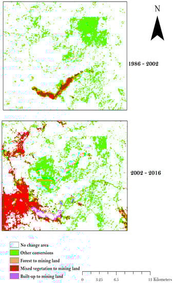 Figure 5 shows the spatial trajectory of land cover changes in the study landscape. In the figure, a particular emphasis is placed on the mining land conversions. The most significant conversion trajectory was from mixed vegetation to mining land use, shown in red colour (online version). Thus, a total of 552.24 hectares and 4029.21 hectares of mixed vegetated land was lost to mining activities from 1986 to 2002 and 2002 to 2016, respectively. The land-use change matrices are presented in Table 5 and Table 6.
