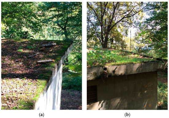 As one of the most important green roof components, and the biggest deficiency when talking about vegetation on a traditional roof, substrate strongly depends on geometry of the roofs and their locations within the area. Even though holding any material is a big challenge for a flat or slightly sloped surface in open area, it is clear nearly all roofs in the area could do this in different amounts. There are basically two different types of roofs in the study area: while the first group possesses only a horizontal surface, those which belong to second group are surrounded with 10 cm raised concrete barrier frames from the roofs’ surfaces, which turned the roof surface into a shallow pool to collect substrate material easily (Figure 2a,b). The main materials of the substrate on the roofs are leaves and branches from the trees in the area; sand, soil and dust brought by the wind, fauna and any other natural way; and dead plant matters from the previous years. The roofs in the first group naturally has only a few millimeters to centimeters of substrate because wind, rain and other natural factors can easily remove it from a flat surface just like the way they were brought. However, the second group might hold as much substrate as artificial extensive green roofs have, owing to their more suitable conditions compared to the first ones.
