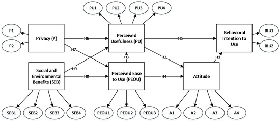 A special adaptation of the Reasoned Action Theory (TRA) [55] has been introduced by [56] in the form of a Technology Acceptance Model (TAM). According to TRA, the behavior of an individual is determined by the individual’s intention to perform that behavior. Such intention is the result of a joint function and/or influence of the subjective norms and of the attitude of the individual towards the participation in that specific behavior. TAM postulates that the use of a technology (i.e., actual adoption of technology) can be predicted as the behavior in the individual’s intention to use technology (BIU). The individual’s intention to use may be determined by his or her attitude towards the use of that technology. Thus, based on the original TAM model, the following hypotheses are formulated: