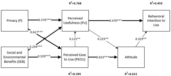 Therefore, more information is needed, which are specific factors that can affect the usefulness of a particular technology and the ease of use from an individual perspective. [58] suggested that the user’s behavioral beliefs included in the TAM could be affected by external variables. These variables influence the behavior of intention-of-use (BIU) through perceived utility and perceived ease of use [57]. As such, this research uses LBS Privacy and Social and Environmental Benefits as external factors that affect the perceived utility and perceived ease of use in TAM. The rest of the research hypotheses, presented in the following sections, are completely coherent with the TAM formulation and do not alter, in any way, the reasoned theory of TAM on TRA.