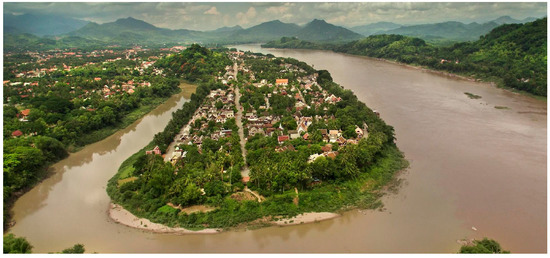 The peninsula of Luang Prabang, surrounded by the Nam Khan River (left) and the Mekong River (right) [30]