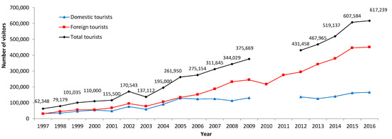 Number of domestic and foreign tourists arrival in Luang Prabang from 1997 to 2016 [31]. Note: Total number of tourists in 2010 and 2011 were unknown due to missing data of domestic tourists in 2010 and 2011.