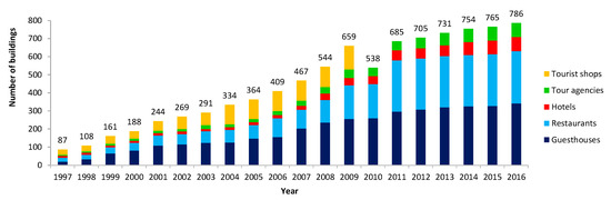 Engelhardt, in his essay for the book entitled Luang Phabang, an Architectural Journey, cautioned that tourism is a double-edged sword [27]. If tourism grows unregulated, it could have adverse impacts on the heritage site. In fact, the trend of tourism growth in Luang Prabang has drawn a stern warning from the World Heritage Committee [19]. The development has reached the threshold level and asserted severe pressure on the landscape of Luang Prabang. Since the town became a World Heritage Site, it has received unprecedented numbers of tourist arrivals. Figure 2 and Figure 3 illustrate the number of tourists and touristic buildings in Luang Prabang from 1997 to 2016, respectively. The earliest record in 1997 shows that total number of tourists visiting the site was 62,348 [31]. By 2016, the number soared 890% to 617,239. The rapid increase in tourist arrivals is contributed significantly by foreign tourists. The expansion of the airport runway in 2012 enabled larger aircrafts to land and increased capacity to receive more tourists [32,33]. Similarly, there was a boom in construction of touristic buildings, such as guesthouses, hotels, restaurants, tourist shops, and tour agencies. The number of touristic buildings jumped by 803% from 87 in 1997 to 786 in 2016. Among them, guesthouses and restaurants are the most dominant type of touristic buildings constructed over the years to fulfill the increasing demand of tourism. There are diverse views in perceiving the impact of tourism growth and how it changes the landscape of Luang Prabang due to a lack of empirical evidence to verify the actual situation [16] and quantify how the increase of touristic buildings has affected or altered the landscape.