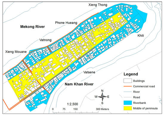 - Sitthivan, S.; Komoto, J.; Abe, H. Actual situation of PSMV and problem in historic conservation area in Luang Prabang Province, Lao PDR. J. Arch. Plan. 2005, 591, 119–124. (In Japanese) [Google Scholar] [CrossRef]