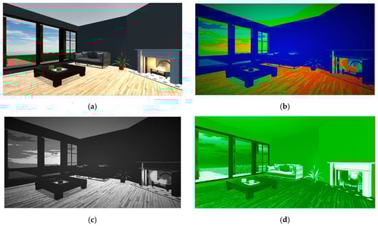 Normal (a), thermal (b), infrared (c), and night vision (d) shaders used in a virtual architecture scene in the Unity game engine, enable the users to visually switch among important physical information, such as heat and light in real-time.