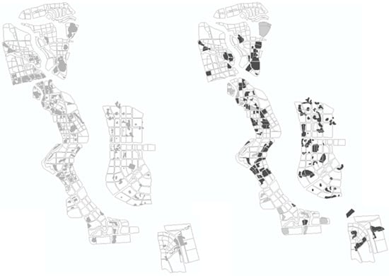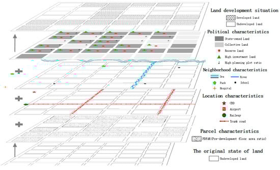 The mechanism of LDR in Chinese cities is the combination of policy and economic orientation, which is the result of mutual cooperation and competition between government and enterprises. The status of land development and redevelopment in the research area as shown in Figure 4. Therefore, this article explains the variables from the two different standpoints of the government and enterprises. For the government, it focuses on analyzing the factors that affect land development from a macro perspective. In the selection of LDR, the first consideration is given to the transport resources, natural resources, and the economic condition of the developed blocks. As for enterprises, they usually focus on economic revenue and the long-term development by themselves, and more attention is paid to the feasibility of the project and the economy of the enterprise. It shows that the land development mechanism of the government + enterprises is the main driving force for urban development. From the perspective of government and enterprises, the four types of factors in the improved hedonic model are analyzed separately.