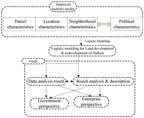 We chooses a typical Chinese rapid development city, Haikou, as the case study. Based on the development and redevelopment situation of 420 blocks along the Nandu River of Haikou, the key factors of its exploitation and utilization are studied. Based on the improved hedonic price model, the influencing factors are divided into four parts, including parcel characteristics, location characteristics, neighborhood characteristics, and political characteristics. On the basis of the above analysis, some institutional factors such as quantifiable political factors and property rights factors are added, and different hypotheses in the previous literature are tested. The framework of this paper is shown in Figure 2.