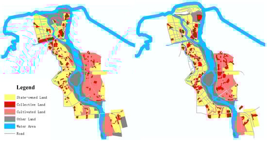 The insignificant nature of land property rights (2) indicates that neither the urban collective land nor the rural collective land is the primary choice for development and redevelopment. Here, they both are referred to as collective land. With the increasing shortage of land resources, there are many reasons for inefficient uses of storage and space resources in collective land. Because of the poor foresight of the government’s early urban planning, the lack of power in the village land acquisition, and the lack of land control, the majority of urban villages have spread. The difference of the architectural form of the house and land location results in villages near the city centers increasing building floors to expand the scale of construction, while the suburban villages increase the scale of construction by expansion in both the horizontal and vertical planes. Later, land in a prime location was used for the development of real estate, but some of them are not developed because of the high cost of relocation and compensation. For the villages with unfavorable locations that are far from downtown, the use of urban and rural mixed land provides opportunities for spatial expansion and urbanization of suburban villages. As for the rural collective land, farmers can change farmland into rural homesteads, which offsets the loss caused by land expropriation, housing demolition and incremental expansion of land. But the spatial scope of land has shifted, resulting in a sharp decrease in cultivated land area. Changes in collective land use are shown in Figure 5.