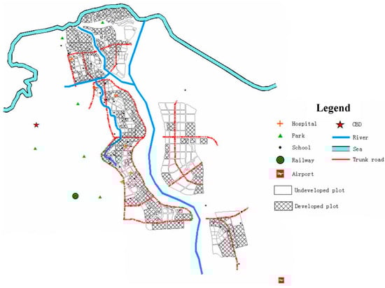 - Parcel characteristicsThe characteristics of parcels generally meant physical elements, meaning the pre-development floor area ration (FAR). These attributes will not disturbed by external factors. There were no buildings or structures before the original parcels were developed, and the FAR was zero. However, most urban land has already been developed in the process of urbanization in China but the efficiency of use and economic benefits are low. There is also much unused land that is not developed after gaining approval and most housing amenities are not able to meet the needs of urban residents today. With the concept of land use intensification [28] and sustainable development based on urban smart growth that attempt to balance growth while fulfilling economic, social, and environmental needs [29,30], a large amount of urban stock land has been redeveloped. Thus, the concept of pre-development FAR was realized. If there are large structures or buildings on the original parcels, the pre-development FAR will be high, and the demolition of the original structures will be hampered to some extent. That directly results in a greater difficulty of redevelopment of the parcels. Based on the reasons above, this paper chooses pre-development FAR as the main feature variables of parcels.