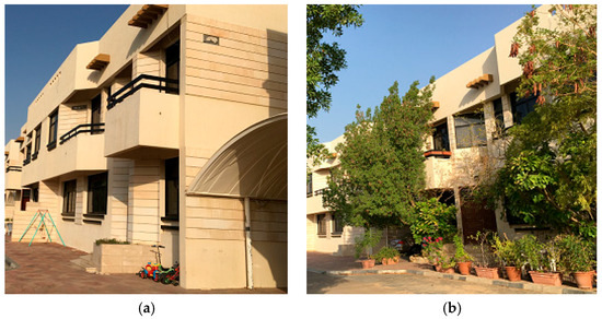 Plant-shaded façade in comparison with unshaded façade of identical housing units, Al-Ain, where (a) Unshaded building façade (bare wall), (b) Plant-shaded façade (plant-shaded wall).