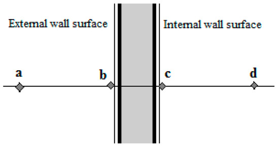 In order to truly represent the prevalent weather conditions, i.e., higher irradiance and higher heat load, and avoid the intervention from occupancy of the houses, the summer holiday season was selected to test unoccupied buildings. The experiments were conducted from the end of June to mid-August to study the impact of plantation as heat insulators in extreme hot weather and determine the resulting cooling effect indoors in residential spaces. To determine the temperature regulation effect of plant-shaded wall on indoor spaces; temperatures at four locations were recorded for both façades, using “DaqPRO” Omega data loggers: (a) outdoor ambient air temperature (1 m away from the external wall); (b) external surface temperature; (c) internal surface temperature; and (d) indoor air temperature (1 m inside from the internal wall) as shown in Figure 3. Considering spatial temperature distribution, the temperatures at each side (a–d) were measured at three points separated by a distance of 1 m each, and the average of the three is plotted.