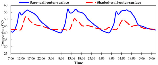 The temperature drop achieved by the shaded wall at the interior surface eventually transmitted less heat to indoors compared to the bare wall. The heat transmitted indoors (Q) is calculated by applying combined convection and radiation heat loss (U) represented by Equation (1). The U value is represented by U = 5.9 + 3.4 v in the air velocity (v) at 0.5 m·s−1 [27].