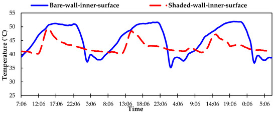 The reduced external surface temperature on the shaded wall naturally resulted in a reduction of the internal wall surface temperature compared to the internal wall surface temperature of bare wall shown in Figure 5. The internal surface temperature of the bare wall peaked at 50 ± 0.5 °C, while that of the plant-shaded wall peaked at 47 ± 0.5 °C for the same day, showing a drop of 3 °C. Similarly, the temperature increased on the plant-shaded wall with a time delay, when compared to the bare wall. The bare wall again remained at or above the maximum temperature achieved by the plant-shaded wall for at least 6 h from 2 p.m. to 8 p.m. A similar behavior can be observed for the rest of the two days presented.