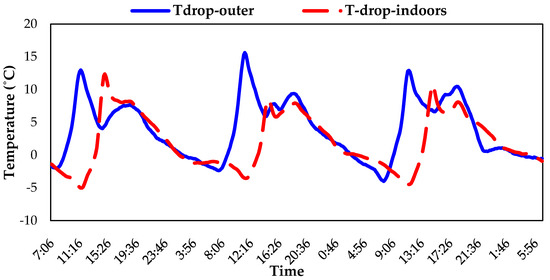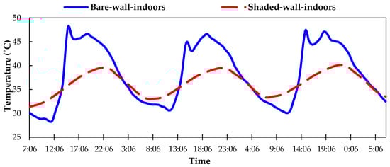 As shown in Figure 6, the indoor air temperature in the case of plant-shaded walls always showed a decrement, time lag and reduced duration of peak temperature compared to that of bare wall confirming the cooling effect produced by the plants. The peak indoor air temperature in the case of bare wall reached 47 °C, while that of the plant-shaded wall reached 39 °C, showing a drop of 8 °C. A very important finding is that the indoor temperature reached its peak very late in the evening, at 8 p.m., compared to that of bare wall at 2 p.m., showing a time lag of 6 h. A similar behavior can be observed for the rest of the two days presented. At nighttime, indoor air in the bare wall showed an increased rate of cooling, yielding a lower temperature compared to the plant shaded wall attributed to the heat retention of the plant shaded wall.