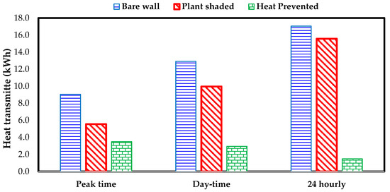 The difference of heat transmitted by bare wall and plant-shaded wall can be considered as cooling load capacity savings. The peak cooling capacity required by the bare wall reached 1.7 kW, which was reduced to 1.3 kW in the case of the plant-shaded wall. Since both the spaces have the same type of air conditioning system installed, net heat gain in certain duration of time can be regarded as cooling demand of the building. The net cooling demand is calculated for three different time frames, i.e., morning till peak time (2 p.m.), day time only (7 p.m.), and on 24 hourly basis, as shown in Figure 9. The plant-shaded wall always demanded less cooling compared to the bare wall, thus saving cooling load. Cooling load saved by the plant-shaded wall till the peak time was 3.5 kWh, which was reduced to 2.9 kWh on the day time basis and 1.5 kWh on the 24 h basis. Since the cooling demand season prevails from March to October in Al-Ain, cooling demand savings per year can be extrapolated by multiplying the daily saving by 245 cooling days, resulting in 367 kWh/year, which is much higher than the reported values of 44 kWh in Metro Orlando, FL [14,15] predominantly due to hot summer condition sin UAE.