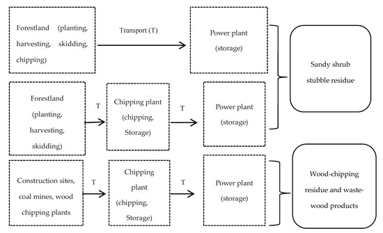 Supply chain theory, the MLP method, and a sensitivity analysis are employed to conduct empirical research. The supply chain is seen as a network that consists of logistics, information and capital flow in order to effectively deliver the product to the consumer with the lowest cost. There are various MLP models currently used in practical work. The first method is to transform several goals into a relatively single target, such as the linear weighting method. The second method is the hierarchical sequence method. The third method is the analytic hierarchy process (AHP), which is suitable for the multi-objective analysis without necessary data and serves as a kind of qualitative and quantitative combination. A sensitivity analysis is used to explore the relationship between relevant factors and key indicators [41]. In this paper, the supply chain of the forest biomass industry concerns planting, harvesting, skidding, storage, chipping and transportation and optimizes the entire supply chain process with the goal of minimizing the total cost. The three key raw materials in this paper are sandy shrub stubble residue, wood-chipping residue and waste-wood products; the transportation path of three key raw materials is shown in Figure 2. The first MLP method is applied to optimize the trade-offs between the economic and environmental benefits by the Solver, including which are the weight of cost and CO2 function, respectively. The sensitivity analysis is employed to explore the impact of the key parameters in transportation and chipping on the optimal supply chain solution.