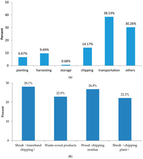 The optimal supply cost percentages of each node and three key raw materials are presented in Figure 3a,b. In Figure 3a, the transportation cost accounts for 38.53% of the total cost, which represents a significant portion; the percentage of others is 30.26%; the third largest is the cost of chipping, accounting for 14.17%. In Figure 3b, the largest percentage of sandy shrub stubble residue (chipped in the forestland) is 28.1% and the smallest percentage of sandy shrub stubble residue (chipped in the chipping plant) is 22.2%.