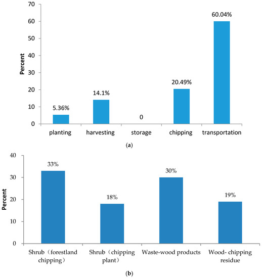 The percentage of optimal CO2 emissions for each node and three key raw materials is presented in Figure 4a,b. In Figure 4a, transportation accounts for 60.04% of CO2 emissions, which is a significant portion; chipping accounts for 20.49% of CO2 emissions; the third largest is the CO2 emissions of harvesting, accounting for 14.10%. In Figure 4b, the largest percentage of sandy shrub stubble residue (chipped in the forestland) accounts for 33% of CO2 emissions and the smallest percentage of sandy shrub stubble residue (chipped in the chipping plant) accounts for 18% of CO2 emissions.