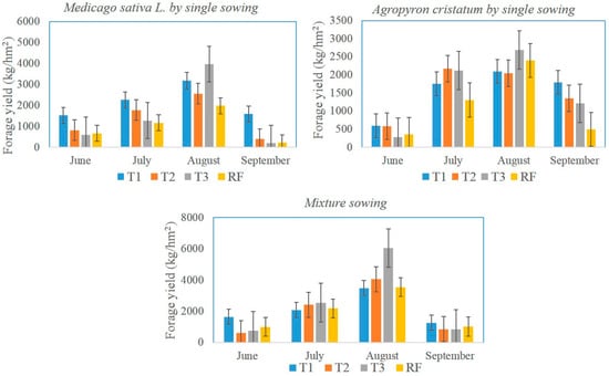 Table 2 and Figure 1 show that for both species and sowing ways, forage yields in August—especially under T3 treatment—were significantly higher than those in other stages. The values decreased in September. Furthermore, in the stages except August, T1 usually obtained insignificantly higher forage yields than most other treatments. For all stages, the irrigation treatments always have slightly higher forage yields than RF.