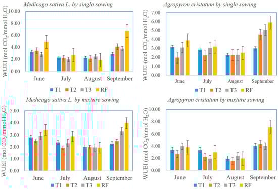 Table 2 and Figure 2 show that comparing to other stages and treatments, WUEIs were significantly higher in September especially under RF for both species and sowing ways. For M. sativa of both sowing ways, WUEIs were a little low in July and August under the four treatments. For A. cristatum of both sowing ways, WUEIs were a little low in August especially under T2.
