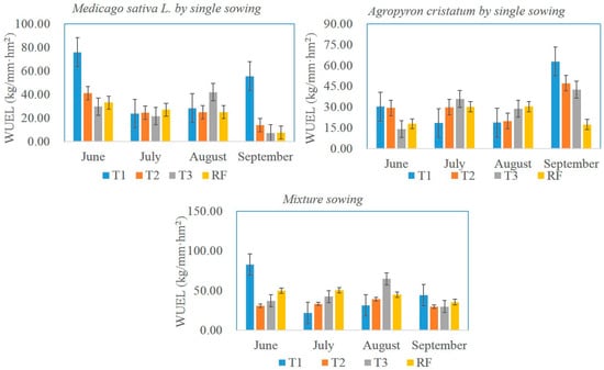 Table 2 and Figure 3 show that comparing to most other stages and sowing ways, WUELs were significantly higher in June and September under T1 for the single sowing of M. sativa and the mixture sowing, and in September under T1 for the single sowing of A. cristatum. The differences of WUELs in most other stages and sowing methods were not significant, since they belong to the same groups.