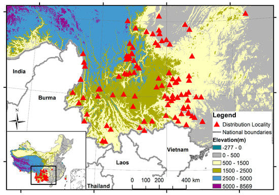 A total of 106 occurrence records of E. adenophorum were collected (Figure 1). Eight of them were derived from the Global Biodiversity Information Facility (GBIF) [18], and the others were collected from the published literature [19,20,21,22,23,24,25,26,27,28,29]. Three-quarters of the records were randomly selected to compose the training set, while the rest of the records composed the test set. The selection of training and test records was processed in DIVA-GIS [30].