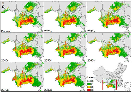 The distribution of Eupatorium adenophorum at present and in the future (2020s–2080s). The future projections were based on the CCCma-CGCM3 (third version of Canadian Centre for Climate Modelling and Analysis Coupled Global Climate Model) under the A1b scenario. L0–L3 stand for the potential distribution probability of 0–0.3 (least potential), 0.3–0.5 (moderate potential), 0.5–0.7 (good potential), and 0.7–1.0 (high potential), respectively.