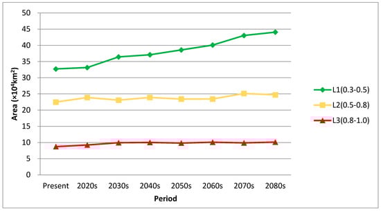 Area variation of L1–L3 from the present to the 2080s in China (L1, L2, L3 represent a potential distribution probability of 0.3–0.5 (moderate potential), 0.5–0.7 (good potential), and 0.7–1.0 (high potential), respectively).