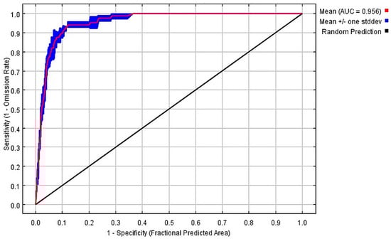Southwest China is where E. adenophorum mainly distributes, as presented in Figure 2. Based on the prediction by MaxEnt, from the present to the 2080s, the areas of L1, L2 and L3 will expand by 34.69%, 9.96% and 16.04%, respectively (Figure 3). In the four main invaded provinces of China, the area of L3 will increase fluctuatingly in the Guangxi, Guizhou and Yunnan provinces by 13.1 × 103 km2, 1.1 × 103 km2 and 0.4 × 103 km2, respectively, while it will decrease by 2.2 × 103 km2 in Sichuan province. The AUC for three replicate runs (Figure 4) ranges from 0.952 to 0.959 and the standard deviation is 0.003, indicating that MaxEnt combined with ENFA could satisfactorily predict the potential distribution of E. adenophorum.