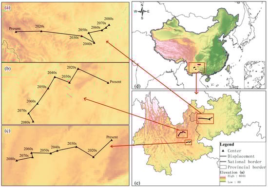 The centers of L1, L2 and L3 in the current and future scenarios are located in different provinces in China (Figure 5). The center of L1 is located in Guizhou Province, while the centers of L2 and L3 are in Yunnan Province, which is southwest of Guizhou. Additionally, from the present to the 2080s, the centers’ displacement of potential distribution levels are different. The center of L1 will move 153.54 km to the northeast, while the centers of L2 and L3 will move 83.33 km and 53.22 km, respectively, to the southwest.
