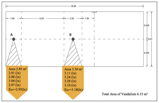 Illuminance measurements evaluate the illumination of a specific location resulting from the light hitting it, by performing lux measurements [16]. In this study, illuminance measurements were performed by measuring the lux levels in a designated area and by subsequently verifying the results of the IESVE software. The measurements of the lighting differences between the two corridors were our main focus. Further measurements for the vandalised areas in the examined corridor were also performed in this study. At the same time, the illuminance measurements were used to calculate the lux levels in the corridors in order to compare the differences in lux levels. Corridor A was vandalised in two wall areas (Figure 3). The points labelled in the corridor represent the maximum distance for a visitor to vandalise a wall and be seen by a passing visitor (Figure 4). The shaded area is the area vandalised in the corridor. Corridor A consists of two vandalised areas, one area of 2.85 m2 and the other of 3.3 m2. Therefore, the total area vandalised in the corridor is of 6.15 m2. The lux level of each vandalised area was measured in the middle using the illuminance measurements. Four reading trials were conducted for each area, and the average lux level of points A and B were approximated to 2.95 and 3.18 lux, respectively.