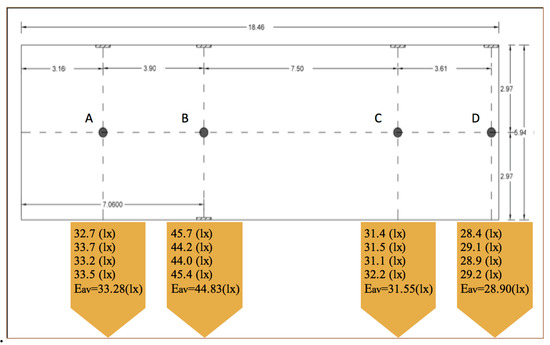 Corridor B is not affected by vandalism; points for measurements were established in the middle of the corridor based on the lamp positions. The lux level was calculated at each point in four readings to calculate the average lux values (Figure 5). Readings of A, B, C, and D were 33.28, 44.83, 31.55, and 28.9, respectively. Because this corridor receives light from the surrounding shops, no vandalised areas are seen in the corridor, differently from corridor A.