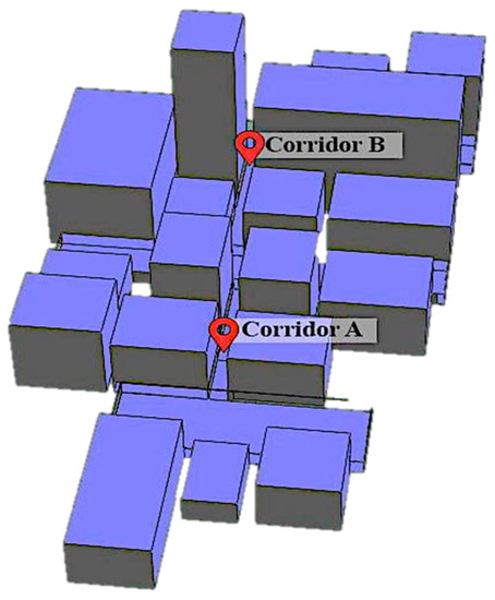3D view of the Abu Shagara site obtained with the IESVE software package, illustrating the locations of corridors A and B.
