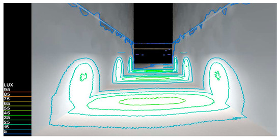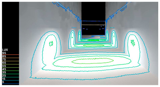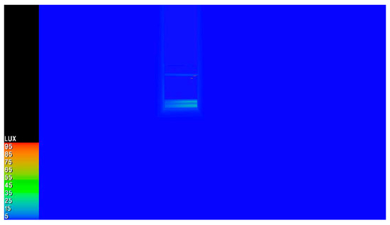 The illuminance simulation with the lighting type L5 showed that the lux levels reached values ranging from 5 to 25 lux, showing a weak distribution of light over the walls, as illustrated in Figure 31 and Figure 32. Case 9 showed the lowest lux levels among all cases; therefore, case 8 was the best choice.
