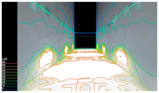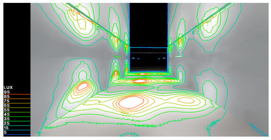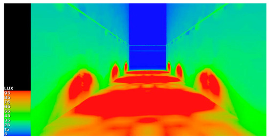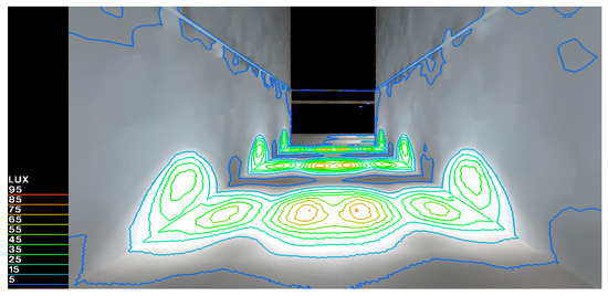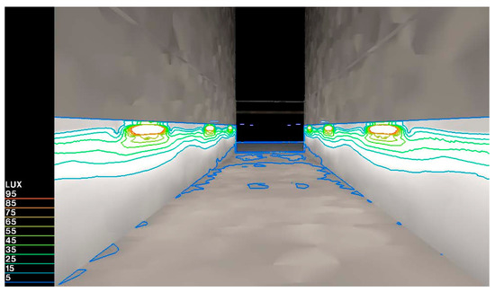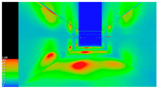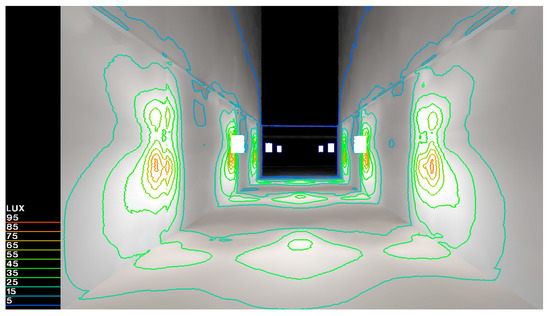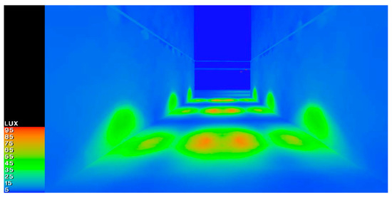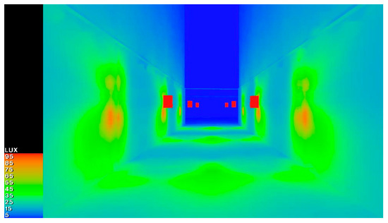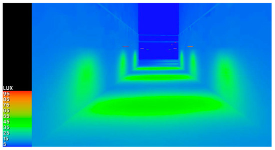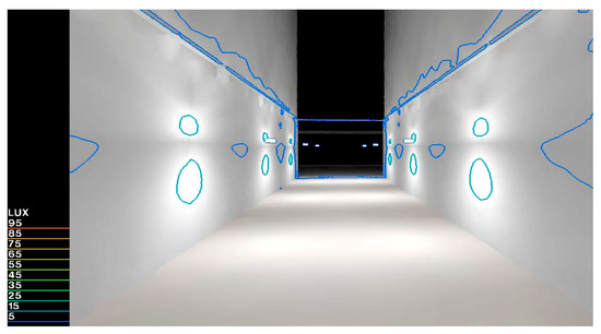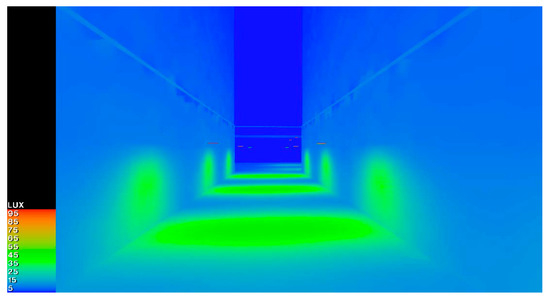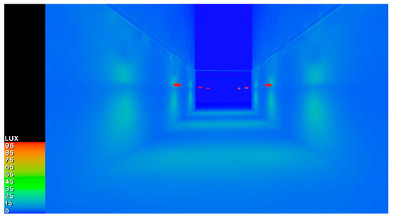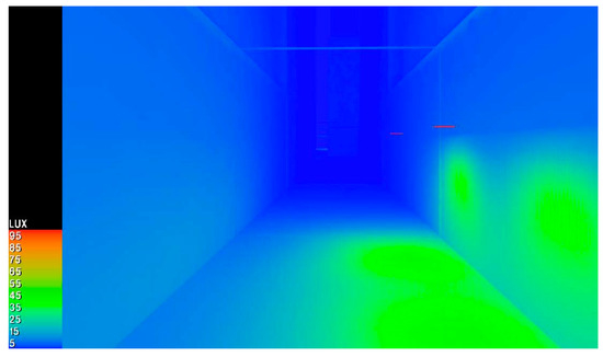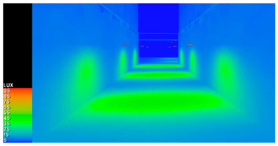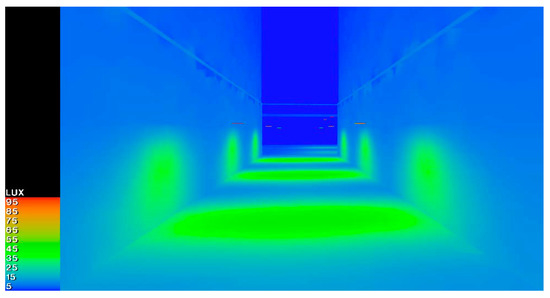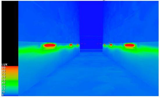 The illuminance simulation in the presence of the lighting type L2 produced lux levels in the range from 45 to 55 lux, with levels ranging from 65 to 75 lux in the middle of the corridor. The light was distributed in a narrow area on the floor and along the lower extremities of the wall, as illustrated in Figure 25 and Figure 26. Case 5 showed higher lux levels than cases 1–4, whereas, when installing lighting type L2, as in case 6, the lux level were not as high as in case 5.